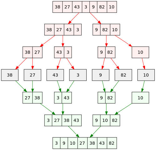 다음 사진에서 빨간부분이 분할단계, 초록부분이 합치는 단계이다. 분할을 해서 값을 비교하여 정렬하고 다시 합치는 로직이다.